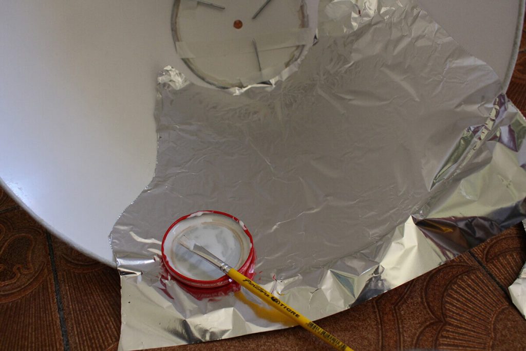 Comprei um kit de canopla tapa furo para colocar no fundo como uma tampa. Feito isso, passei cola quente na parte externa e interna, pra fixar essa tampa no fundo da cúpula do abajour, passando fita isolante (recomendo que não use outros tipos de fitas adesivas) para juntar a tampa às hastes. Em seguida, colei (com cola branca normal e com a ajuda de um pincel) papel alumínio em toda parte interna.