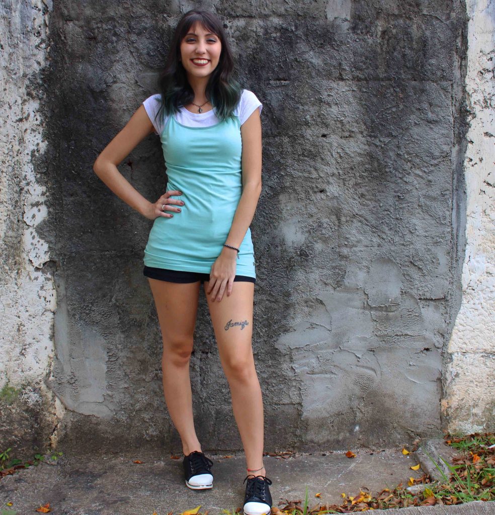 Eu permaneci com a mesma camiseta básica branca por baixo e coloquei uma regatinha verde por cima, bem longa. Para a parte inferior, usei um shorts preto! Confesso que eu ia fazer o look só com o vestido, mas quando provei com a regata, achei que ficou muuuuito legal também!